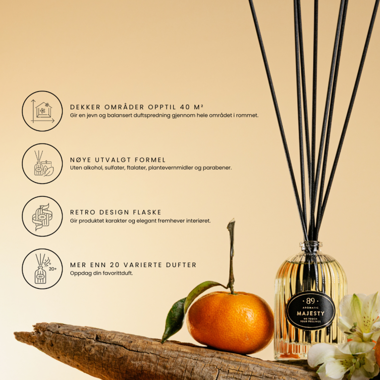Plasser duftpinnene enkelt i flasken og la duften spre seg naturlig. Juster intensiteten ved å legge til, fjerne eller snu pinnene.